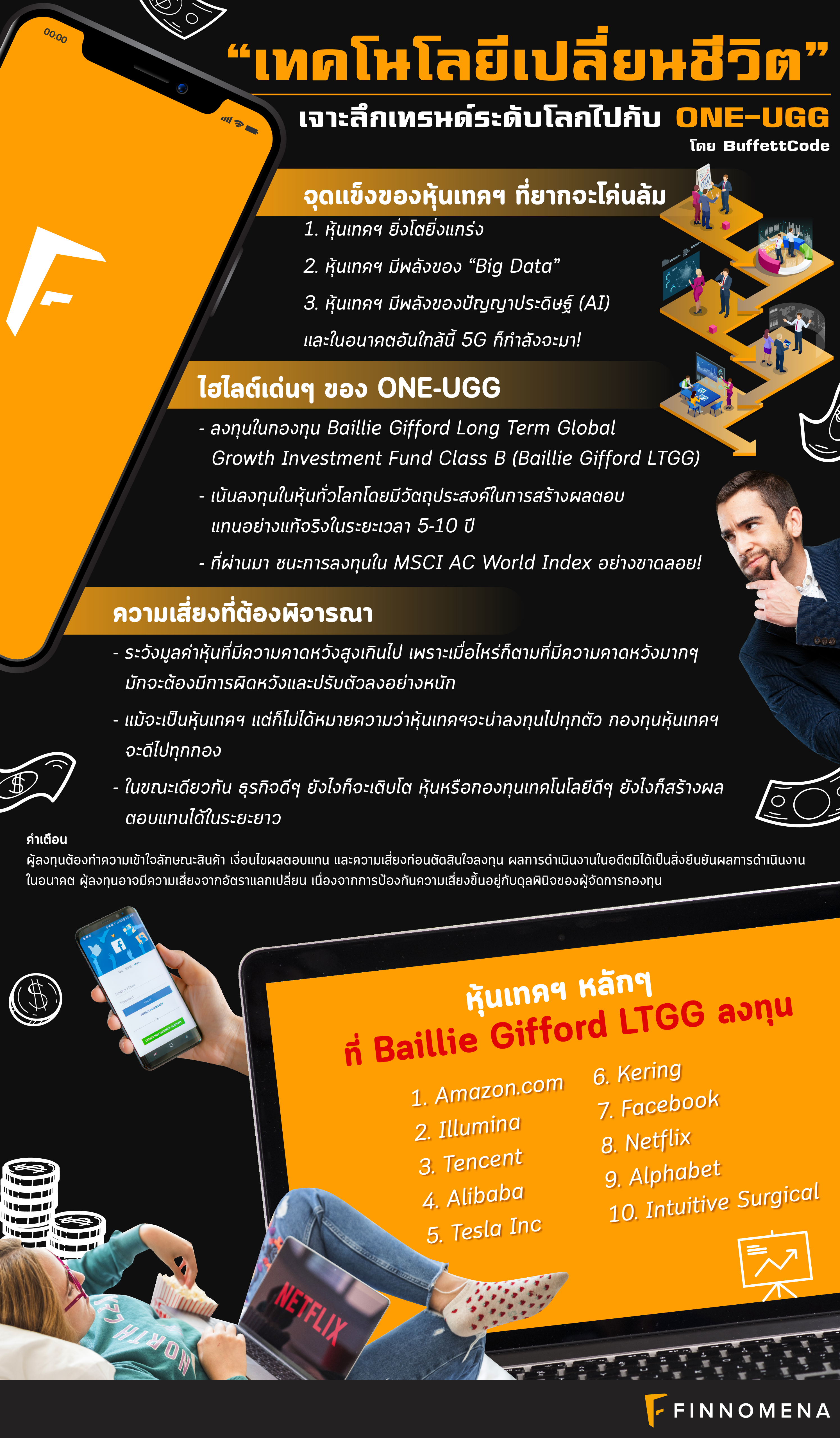 มีกองทุนหุ้นเติบโตเพียงไม่กี่กองที่มีการเติบโตรวดเร็วสมชื่อ กองทุน ONE-UGG เป็นหนึ่งในกองทุนที่สามารถรักษาการเติบโตที่ต่อเนื่องไว้ได้ในระยะยาว กองทุน ONE-UGG มีนโยบายลงทุนในกองทุน Baillie Gifford Long Term Global Growth Investment Fund Class B (Baillie Gifford LTGG) ซึ่งปัจจุบันมีสัดส่วนลงทุน 99.53%
