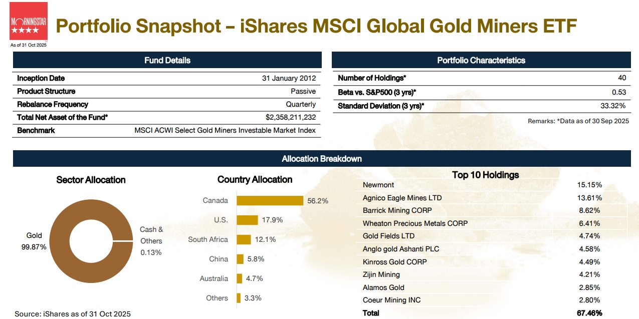 • ลงทุนในหุ้นเหมืองทองคำ ผ่านกองทุนหลัก iShares MSCI Global Gold Miners ETF (RING) ซึ่งเป็น Passive ETF มุ่งสร้างผลตอบแทนล้อไปกับดัชนี MSCI ACWI Select Gold Miners Investable Market Index