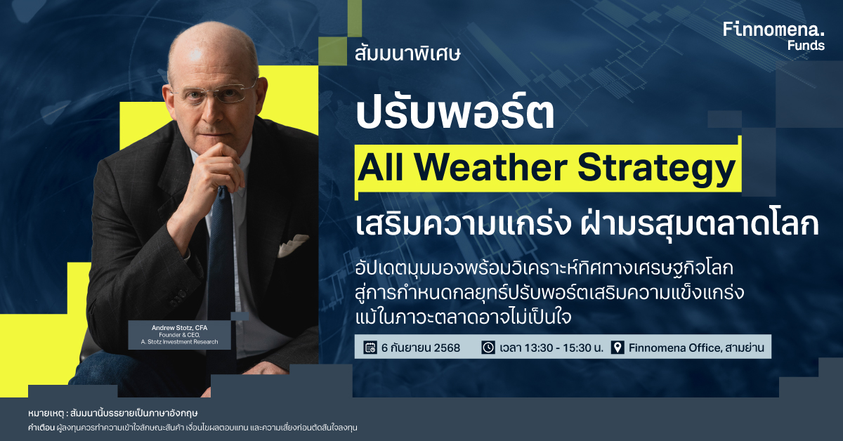 ถึงเวลาปรับพอร์ตประจำไตรมาสของ All Weather Strategy แล้ว! เตรียมตัวให้พร้อม กับการปรับกลยุทธ์ให้เหมาะกับสภาวะเศรษฐกิจโลกที่เปลี่ยนแปลงอย่างรวดเร็ว อย่าปล่อยให้พอร์ตของคุณพลาดโอกาสลงทุนที่กำลังจะเกิดขึ้น พบกับสัมมนา “ปรับพอร์ต All Weather Strategy เสริมความแกร่ง ฝ่ามรสุมตลาดโลก” สัมมนาพิเศษสำหรับนักลงทุน All Weather Strategy ที่จะพาให้คุณเท่าทันทิศทางการลงทุนล่าสุด พร้อมเจาะลึกกลยุทธ์ปรับพอร์ตที่ออกแบบมาเพื่อให้พอร์ตยังยืนหยัดได้ในทุกสภาวะตลาด ครั้งนี้ไม่ใช่แค่การอัปเดตตลาด แต่คือโอกาสที่จะเข้าใจว่า ✔ แนวโน้มการลงทุนล่าสุด จะส่งผลกระทบกับพอร์ตอย่างไร ✔ รอบนี้ควรเสริม หรือลดน้ำหนักสินทรัพย์ไหน ให้พอร์ตแข็งแรงขึ้น ✔ เหตุผลเบื้องหลังการปรับพอร์ตล่าสุดคืออะไร ทั้งหมดนี้เพื่อให้คุณมั่นใจได้ว่า พอร์ต All Weather Strategy ของคุณยังคงยืนหยัดได้ แม้ตลาดจะผันผวนเพียงใด พบกับ Andrew Stotz, CFA Founder & CEO, A. Stotz Investment Research หมายเหตุ : สัมมนานี้บรรยายเป็นภาษาอังกฤษ วัน เวลา สถานที่ วันเสาร์ที่ 6 กันยายน 2568 เวลา 13.30 - 15.30 น. ณ Finnomena office, โครงการ Block 28 อาคาร A ชั้น 2 รับจำนวนจำกัดเพียง 50 ท่าน เท่านั้น (*สงวนสิทธิสำหรับผู้ที่สามารถเดินทางเข้าร่วมงาน ณ สถานที่ดังกล่าวได้เท่านั้น) กำหนดการสัมมนา 13.00 - 13.30 น. ลงทะเบียน 13.30 - 15.10 น. สัมมนาพิเศษหัวข้อ “ปรับพอร์ต All Weather Strategy เสริมความแกร่ง ฝ่ามรสุมตลาดโลก” 15.10 - 15.30 น. Ask me anything ถาม - ตอบทุกข้อสงสัย คำเตือน : ผู้ลงทุนควรทำความเข้าใจลักษณะสินค้า เงื่อนไขผลตอบแทน และความเสี่ยงก่อนตัดสินใจลงทุน หมายเหตุ : การสัมมนานี้จัดขึ้นเพื่อวัตถุประสงค์ในการให้ความรู้ทั่วไป มิได้เป็นการให้คำแนะนำการลงทุนเฉพาะบุคคล นักลงทุนควรพิจารณาความเหมาะสมกับตนเองก่อนการลงทุน