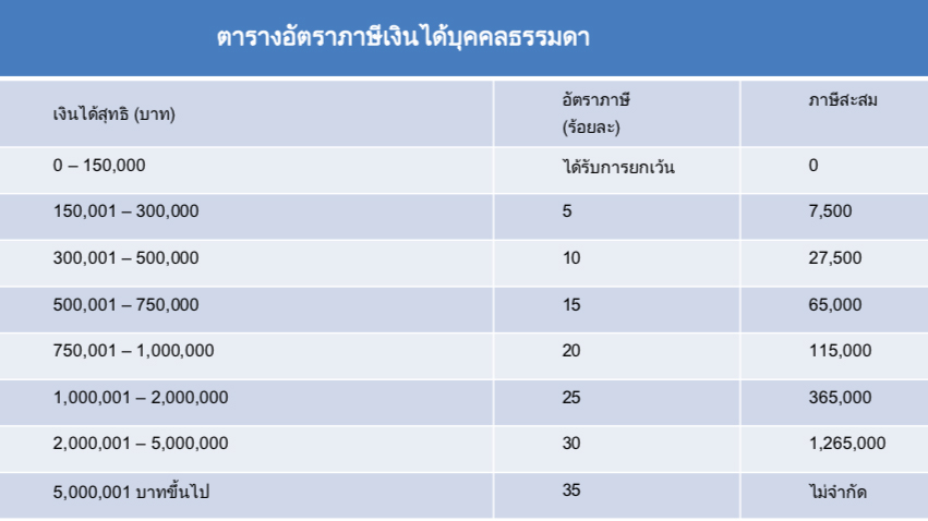 คำนวณเงินได้สุทธิ เพื่อคำนวณเสียภาษีเงินได้ โดยเราสามารถคำนวณเงินได้ของเราว่าอยู่ในอัตราภาษีที่ต้องเสียเท่าไหร่ ได้ตามตารางนี้ค่ะ
