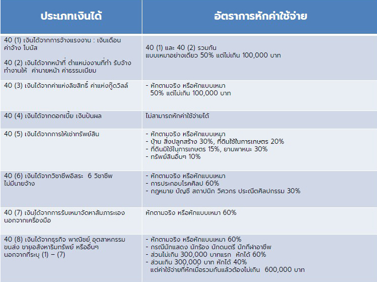 โดยเงินได้พึงประเมินได้แก่ เงิน ทรัพย์สิน / ประโยชน์ซึ่งอาจคิดคำนวณเป็นเงินได้ เงินค่าภาษีอากรที่ผู้อื่นจ่ายแทนให้ เครดิตภาษีตามที่กฎหมายกำหนด สิ่งแรกเลย คือ เราต้องรู้ว่าเงินได้ของเราเป็นประเภทไหน หักค่าใช้จ่ายได้เท่าไหร่ เรามาดูรายละเอียดตามตารางนี้ได้เลยค่ะ