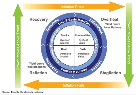 Investment Clock คือแนวคิดที่มองว่า ไม่ว่าจะเป็นช่วงเวลาใด จะมีสินทรัพย์หนึ่งๆที่ให้ผลตอบแทนได้ดีเสมอ โดยศึกษาจากประวัติศาสตร์ที่ผ่านมาเป็นหลัก เช่น ยามที่เศรษฐกิจฟื้นตัวดี กลุ่มหุ้นตามวัฏจักรจะให้ผลตอบแทนได้ดีกว่าเงินสด กลับกันหากเศรษฐกิจพังครืนลงมาเงินสดก็อาจให้ผลตอบแทนที่ดีกว่าได้ ซึ่งสามารถาแบ่งวัฏจักรเศรษฐกิจและสินทรัพย์ที่เหมาะออกเป็น 4 ช่วงด้วยกัน ดังนี้
