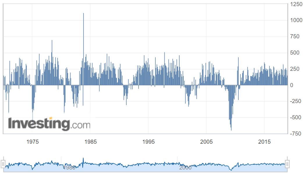 ดัชนีนี้เกิดขึ้นครั้งแรกในปี 1970 หรือคิดเป็นเวลาเกือบ 50 ปี โดยมีการเพิ่มขึ้นสูงสุดของการจ้างงานกว่า 1.115 ล้านตำแหน่ง ในเดือน ตุลาคม 1983 ซึ่งเป็นการจ้างงานเพิ่มขึ้นหลังจากผ่านพ้นวิกฤติเศรษฐกิจละตินอเมริกาช่วงปี 1980 และการลดลงมากที่สุดคือ 699,000 ตำแหน่งในเดือนเมษายนปี 2009 ที่ลดลงต่อเนื่องกว่า 14 เดือน นับตั้งแต่เกิดวิกฤติซับไพรม์ และค่อยๆ มีแนวโน้มดีขึ้นหลังจากนั้น เมื่อเศรษฐกิจฟื้นตัวในภายหลัง