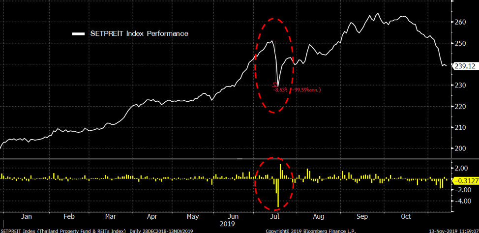 ซึ่งก็ไม่ใช่เรื่องที่น่าแปลกใจนัก เมื่ออัตราผลตอบแทนของสินทรัพย์ชนิดนี้ โดยเฉพาะอย่างยิ่งในประเทศไทยช่างน่าเย้ายวน ทั้งในส่วนของอัตราปันผลที่สูงถึงระดับ 5.70% ต่อปีเมื่อช่วงต้นปี 2019 ซึ่งส่งผลให้กลายเป็นสินทรัพย์ที่น่าสนใจอย่างยิ่ง ในช่วงแนวโน้มดอกเบี้ยขาขึ้นตอนปลาย ก่อนที่จะกลายเป็นขาลงในเวลาต่อมา ส่งผลให้ REITs ไทยและทั่วโลกนั้น ปรับตัวขึ้นอย่างต่อเนื่องทำจุดสูงสุดถึง 30.35% ในวันที่ 25 กันยายนที่ผ่านมา และ 26.78% ในวันที่ 21 ตุลาคมที่ผ่านมา ตามลำดับ