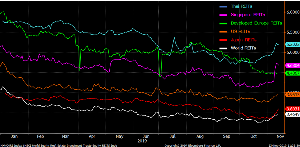 MSCI World, Thai, Singapore, Europe, Japan, US REITs Yield As of 13/11/2019 l Source : Bloomberg