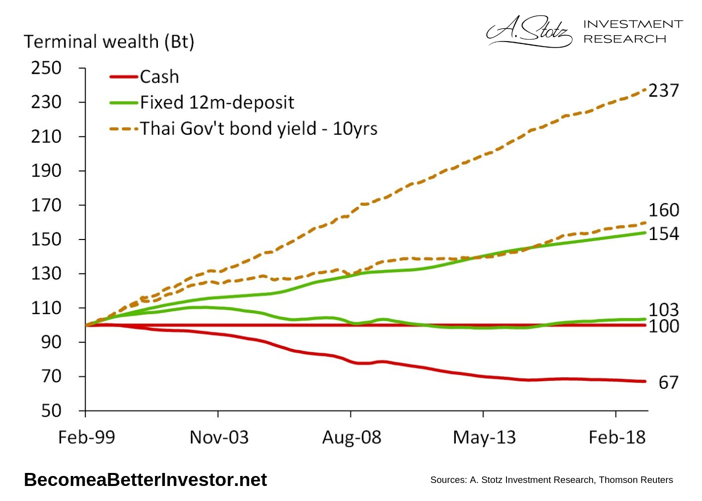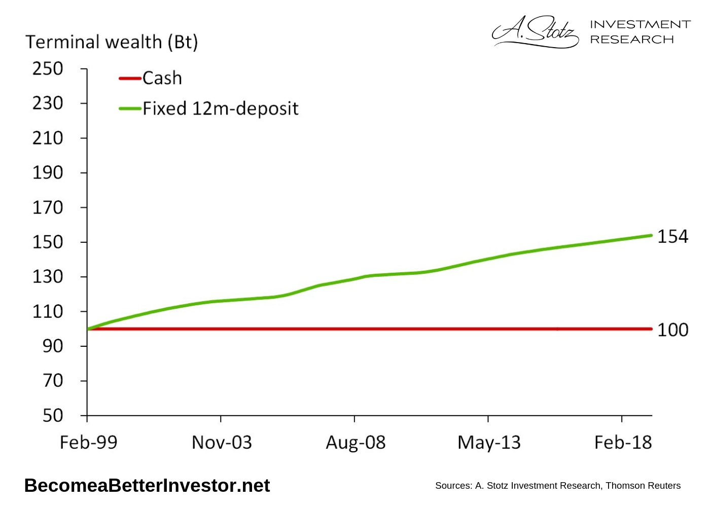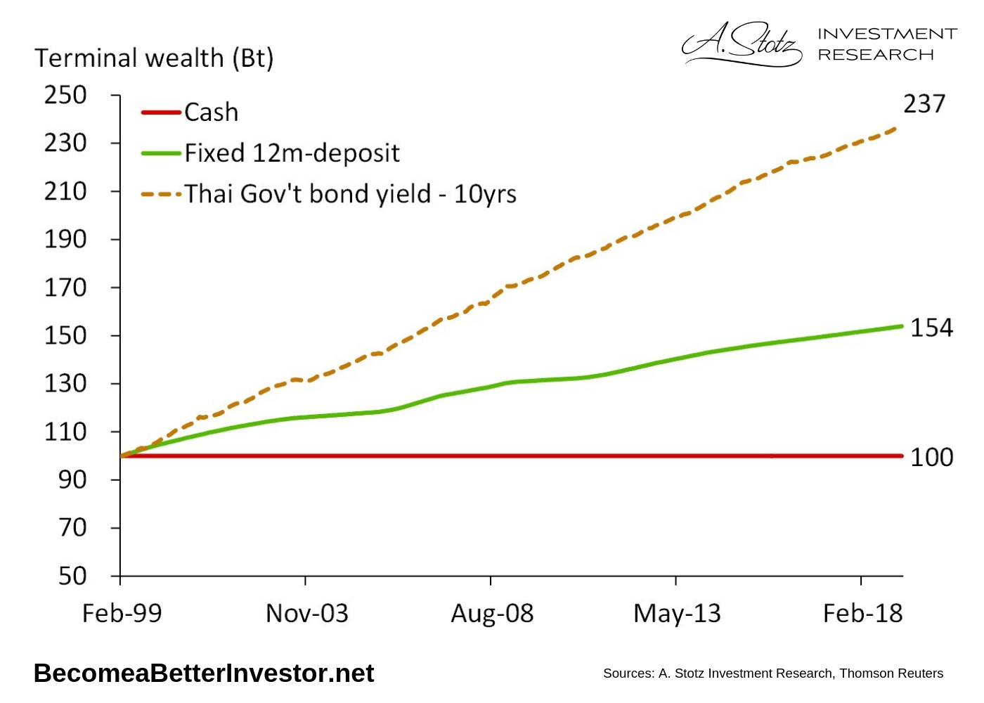 ตั้งแต่ปี 1999 มา การฝากเงินในธนาคารไทยให้ดอกเบี้ยโดยเฉลี่ย 2.2% ต่อปี ถ้าเราฝากเงิน 100 บาทไว้ในธนาคาร ปัจจุบันเราจะมีเงินกว่า 154 บาท ซึ่งแน่นอนว่าดีกว่าไม่มีอะไรเลย