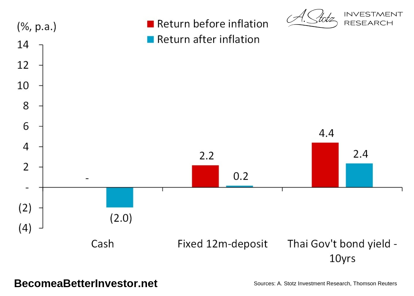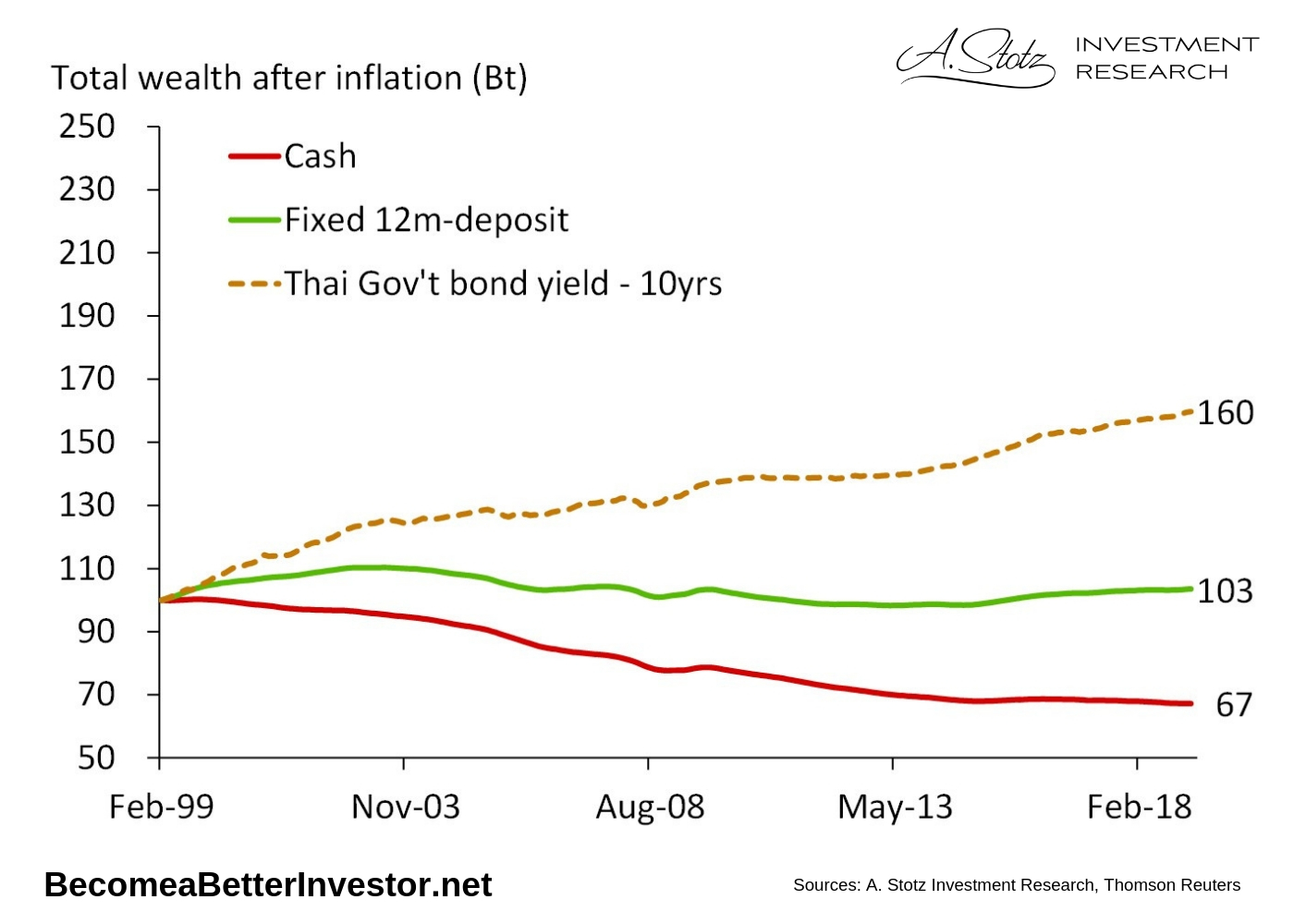 การฝากเงินสดในธนาคารให้ผลตอบแทนแท้จริงเพียง 0.2% ต่อปีหลังรวมผลกระทบจากเงินเฟ้อ ในขณะที่พันธบัตรรัฐบาลให้ผลตอบแทนที่แท้จริงเพียง 2.4% ไม่ใช่ 4.4% ที่เราเห็นกัน