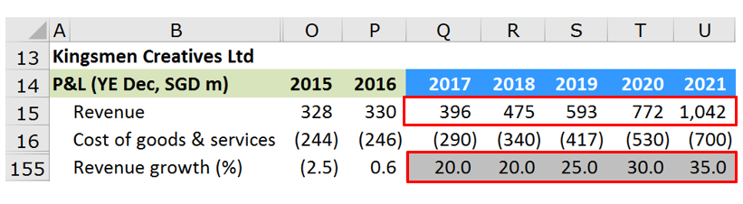 นักวิเคราะห์ส่วนใหญ่มักคาดการณ์การเติบโตของรายได้ในมุมมองที่เป็นบวกเกินไป ภาพด้านล่างนี้เป็นโมเดลการคำนวณสำหรับบริษัท Kingsmen Creative Ltd. เราจะเห็นได้ว่าก่อนหน้านี้อัตราการเติบโตของรายได้บริษัทอยู่ที่ -2.5% แล้วค่อย 0.6% ตามลำดับ แต่แล้วนักวิเคราะห์กลับประมาณการการเติบโตหลังจากนั้นเป็น 20.0%, 20.0%, 25.0% แล้วก็ว่าไปนั่น!! ถ้าเป็นภาษาอังกฤษนี่ก็เป็นการคาดการณ์ที่ overly optimistic หรือมองโลกในแง่ดีเกินไปน่ะครับ