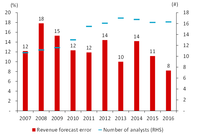 เพื่อที่จะตอบคำถามนี้ ผมขอแชร์งานวิจัยของผมในประเด็นที่ว่า “นักวิเคราะห์คาดการณ์รายได้ได้แม่นยำแค่ไหนในเอเชีย?” ซึ่งโดยรวมทั้งหมดมีถึง 540 บริษัทเอเชียที่ใหญ่ที่สุด ด้วยข้อมูลที่ย้อนหลังไปถึง 10 ปี และนักวิเคราะห์อย่างน้อย 10 คนต่อหนึ่งบริษัท
