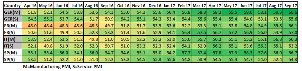 ถึงแม้ยุโรปยังมีความเสี่ยงจากลัทธิชาตินิยม ที่เริ่มเกิดขึ้นตั้งแต่เหตุการณ์ Brexit, นโยบายเศรษฐกิจของทรัมป์ ล่าสุดคือแคว้นกาตาลุญญาที่ต้องการแยกตัวออกจากประเทศสเปน แต่เราก็ยังเห็นภาพการฟื้นตัวของเศรษฐกิจจากตัวเลข PMIs และตัวเลขการว่างงานในภูมิภาคยุโรปอย่างชัดเจน รวมถึงดอกเบี้ยธนาคารกลางยุโรปที่ยังอยู่ในระดับต่ำ ซึ่งเราเชื่อมั่นว่าภาพนี้น่าจะเป็นการฟื้นตัวในระยะยาวครับ