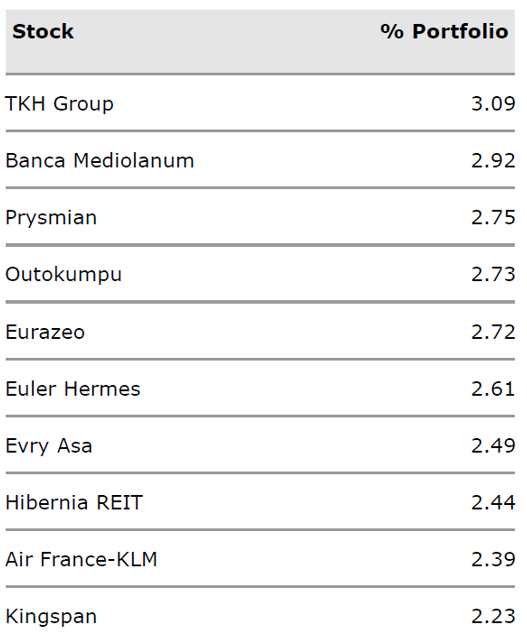 สำหรับ Top Holding นั้น ใน 5 อันดับแรก ประกอบด้วยกลุ่มอุตสาหกรรมออกแบบและผลิตอุปกรณ์อิเล็กทรอนิกส์และระบบรับส่งสัญญาณและกำลัง คือ บริษัท TKh Group ซึ่งมีสำนักงานใหญ่อยู่ที่ประเทศเนเธอแลนด์ และ Prysmian ซึ่งมีสำนักงานใหญ่อยู่ในประเทศอิตาลี ต่อมาเป็นธนาคารในประเทศอิตาลีอย่าง Banca Mediolanum ซึ่งมีบริการครบวงจรทั้งด้านการจัดการสินทรัพย์ ด้านประกันภัย เป็นต้น ต่อมาคือ Outokumpu ซึ่งเป็นผู้ผลิตและแปรรูปสแตนเลส ซึ่งดำเนินกิจการในหลายๆประเทศฟินแลนและสวีเด็น และสุดท้ายคือบริษัท Eurazeo ซึ่งประกอบธุรกิจบริการการลงทุนในบริษัทต่างๆ (Private Investment) ซึ่งดำเนินธุรกิจในประเทศฝรั่งเศส