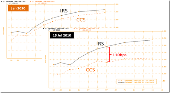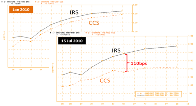 ในช่วงเดือน มิ.ย. – ก.ค. 2010 ที่ผ่านมานี้ เหตุการณ์คล้ายข้างต้นได้เกิดขึ้นอีกครั้ง เมื่ออัตราดอกเบี้ย Cross-currency swap (CCS) ได้ปรับตัวต่ำลงอย่างมาก และที่สำคัญคือ ปรับต่ำลงกว่า Interest rate swap (IRS) curve ถึง –110bps ซึ่งต่ำที่สุดในประวัติศาสตร์เลยทีเดียว แต่ครั้งนี้เกิดจากการที่บริษัทขนาดใหญ่ในประเทศไทยออกหุ้นกู้ (สกุลเงินบาท) และใช้ธุรกรรม CCS เพื่อเปลี่ยน Liability ของบริษัทนั้นจาก THB ไปเป็น USD หรือที่เรียกว่าเป็นธุรกรรมฝั่ง “Liability side” จากลูกค้า Corporate เช่น กลุ่ม ปตท. บ้านปู หรือ Leasing บางบริษัท เพื่อปรับแต่ง Balance sheet ฝั่ง Liability (เงินกู้) นั่นเองครับ