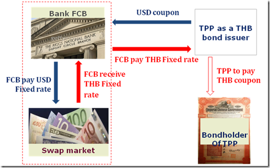 Flow #2 จริงๆแล้วพบว่า TPP กลับต้องการมี liability exposure ในเงินสกุล USD (เนื่องจาก ต้นทุนโดยรวมที่ถูกกว่าการออก USD bond โดยตรง และ/หรือ เพื่อให้ USD ในฝั่ง Liability เป็น Natural hedge กับรายได้ของบริษัทเองด้วย) TPP จึงตัดสินใจทำ Swap ระหว่าง THB กับ USD กับธนาคาร “FCB” ในกรณีนี้เป็นการ swap ข้ามสกุลเงิน THB à USD เราเรียกว่า Cross-currency swap (หรือ CCS นั่นเอง) (ตาม flow ที่ (2))