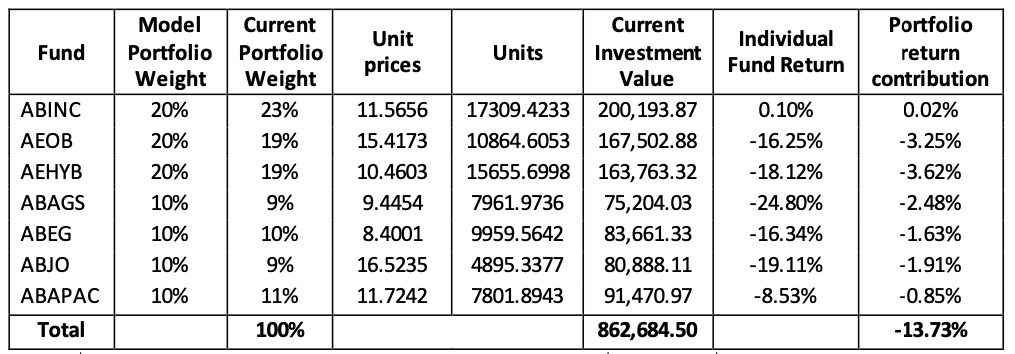 น้ำหนักการลงทุนในพอร์ตการลงทุนยังไม่ได้มีการเบี่ยงเบนไปจากโมเดลต้นแบบสักเท่าไหร่นัก จึงยังคงแนะนำให้ไม่ต้องมีการ rebalance หรือปรับพอร์ตการลงทุน สภาวะความผันผวนของตราสารหนี้ที่ผ่านมาคาดว่าน่าจะปรับตัวดีขึ้นในอนาคต อย่างไรก็ดีหากสภาวะเศรษฐกิจมีแนวโน้มที่จะเข้าสู่สภาวะถดถอยอย่างเต็มที่ ทาง บลจ. จะพิจารณาถึงการปรับพอร์ตการลงทุนอีกครั้ง เพื่อปรับโมเดลไปสู่การลดความเสี่ยงมากขึ้นต่อไป