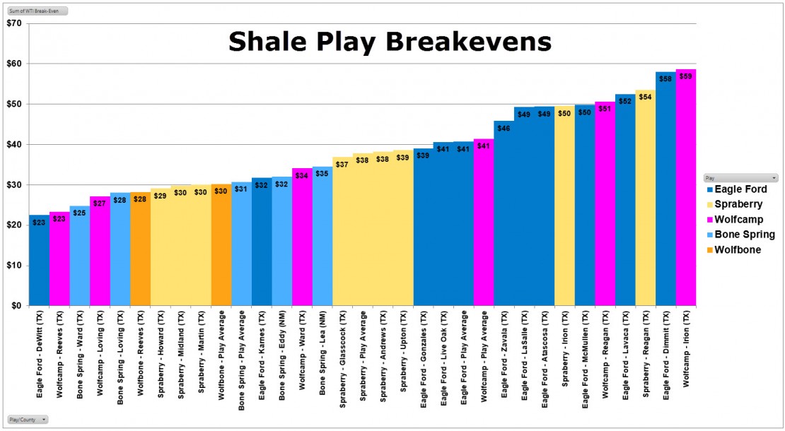 สังเกตไหม มันมีสีเขียวแก่ ซึ่งเป็น Shale Oil ที่ต้นทุนต่ำมาก เกิดจาก Stripper well หรือบ่อน้ำมันที่เคยหยุดใช้งาน แต่กลับมาใช้เทคโนโลยีเช่นการขุดเจาะที่ดีขึ้น ดังนั้นจงเลิกเข้าใจว่า Shale จะต้นทุนสูงไปซะหมด วันนี้จะขอนำผู้ผลิต Shale ทุนต่ำมาโชว์บ้าง ดังรูป