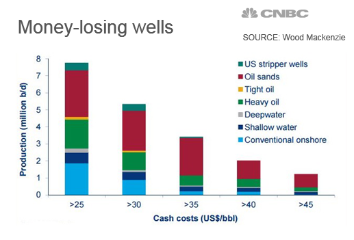 EIA ประเมินว่า Tight Oil จะมีประมาณ 4.2 ล้านบาร์เรลต่อวัน หรือ 49% ของประมาณน้ำมันที่ผลิตในปี 2015 (รวม tight oil สมัยก่อนด้วย ไอที่บอกต้นทุนแพงน่ะมันคือพวกแท่นที่ติดตั้งใหม่ครับ) ดังนั้นจริงๆแล้วการผลิตแบบอื่นๆยังมีอยู่ตั้งครึ่งหนึ่งแน่ะ ต้องขอขอบคุณ Wood Mackenzie เลยครับ สมดีกรีจริงๆ เค้าคิดมาให้แล้ว ว่าราคาน้ำมันปัจจุบันที่ $40 มีเด็กดื้อฝืนผลิตแบบขาดทุนอยู่ 2 ล้านบาร์เรลต่อวัน ดังรูป โดยอิงจากต้นทุนการผลิตน้ำมันโดยตรงหรือ Cash Cost แล้วมันเยอะขนาดไหน สิ้นปี 2015 รายงานว่ามีปริมาณการผลิตน้ำมันต่อวันทะลุ 97 ล้านบาร์เรลต่อวันไปแล้ว หักไป 2 ก็ลงมาใกล้เคียงกับปริมาณอุปสงค์ที่ IEA คาดไว้ที่ 96 ล้านบาร์เรลต่อวันในปีนี้ เพียงแต่มีแนวโน้มว่าอุปสงค์จะน้อยกว่าที่คาดจากภาวะเศรษฐกิจโลก