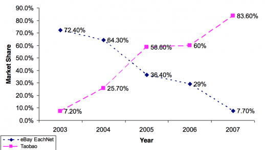 สุดท้ายในปี 2007 ebay พยายามแก้เกมปล่อย Eachnet ออกจากการควบคุมของ ebay Global และเปิด ebay.cn เพิ่มเพื่อใช้เป็น Platform ที่เชื่อมต่อกับ ebay Global ยกเลิกการเก็บค่าธรรมเนียมทั้งหมด แต่ทุกอย่างนั้นสายไป ในปี 2003 Taobao จากเป็นแค่จระเข้น้อยในแม่นํ้าแยงซี แต่ในปี 2007 กลายเป็นจระเข้หนุ่มแข็งแกร่งซึ่งมี Market share สูงถึง 83% เพิ่มจากแค่ 7% ในปี 2003 ใช้เวลา 4 ปีครองตลาด C2C เกือบทั้งหมดเอาชนะ ebay คู่แข่งระดับโลกได้อย่างหมดจด ด้วยความเข้าใจในตลาดเมืองจีนที่มากกว่า, สร้างนวัตกรรมมากกว่า, มีพันธมิตรที่เข้มแข็ง และที่สำคัญที่สุดคือการปรับตัวอย่างรวดเร็ว