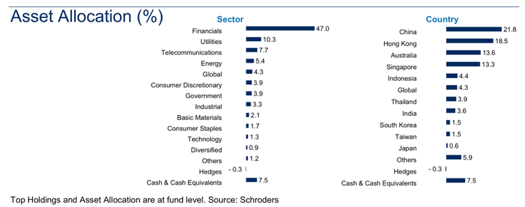 พอเข้าไปดูสัดส่วนการลงทุนของ Schroder Asian Income Funds ก็พบว่ากว่า 21.8% มาจากจีน อันดับ 2 คือฮ่องกงที่ 18.5% โดยการลงทุนหลักๆ ของกองทุนอยู่ใน Financial Sectors ซึ่งก็รวมไปถึงกองทุนอสังหาฯ (REITs) และพันธบัตรของบริษัทต่างๆ ด้วย จะเห็นว่าแม้จะลงทุนในจีนแต่ก็เป็นการลงทุนในสินทรัพย์ที่มีความผันผวนน้อยและมีการเติบโตตาม GDP ได้อย่าง REITs เป็นต้น