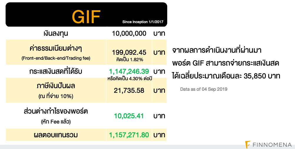 - ในมุมผลตอบแทนด้านกระแสเงินสดพอร์ต GIF ถือว่าให้กระแสเงินสดกลางๆ ค่อนข้างไปในทางสูง ปีหนึ่งจ่าย 12 ครั้งถือว่ามากที่สุดในสินทรัพย์การลงทุนทั้งหมด