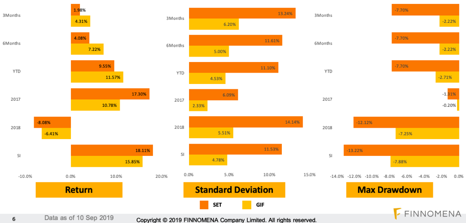 เมื่อเปรียบเทียบความผันผวนระหว่างพอร์ต GIF กับ SET จะพบว่าความผันผวนน้อยกว่าพอสมควร ในปี 2018 SET ผันผวนถึง 14.14% แต่ GIF ผันผวนเพียง 5.51% เท่านั้น การลงทุนพอร์ต GIF จึงเป็นพอร์ตที่แม้ผลตอบแทนอาจไม่เท่ากับการลงทุนในหุ้นล้วนๆ แต่เป็นพอร์ตการลงทุนที่ให้ผลตอบแทนเป็นกระแสเงินสดเลี้ยงชีพได้อย่างต่อเนื่อง และที่สำคัญกินอิ่ม นอนหลับแน่นอน