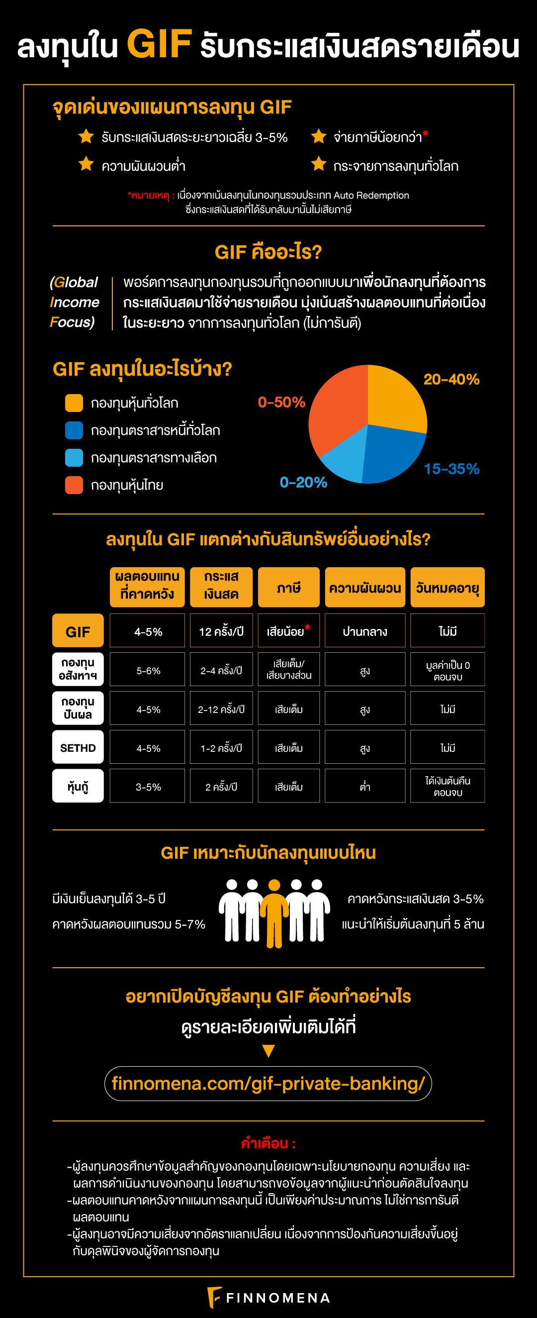 GIF หรือ Global Income Focus คือพอร์ตการลงทุนกองทุนรวมที่ถูกออกแบบมาเพื่อนักลงทุนที่ต้องการกระแสเงินสดมาใช้จ่ายรายเดือนและมุ่งเน้นสร้างผลตอบแทนที่ต่อเนื่องในระยะยาว
