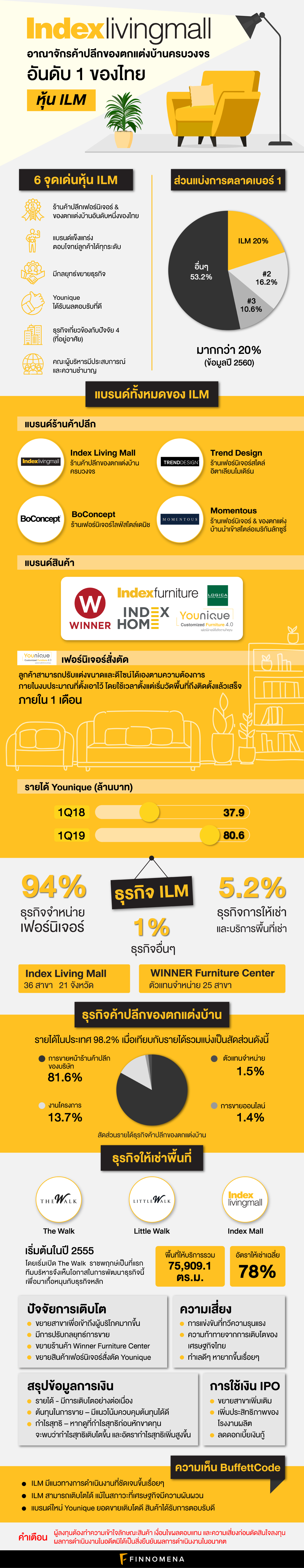 หุ้น ILM หรือ Index Living Mall คือหนึ่งในผู้นำร้านค้าปลีกของตกแต่งบ้านของไทย ด้วยส่วนแบ่งการตลาดมากกว่าร้อยละ 20 (ข้อมูลปี 2560) ธุรกิจของ ILM ครบวงจร ตั้งแต่การผลิตไปจนถึงการขาย ติดตั้ง และงานบริการหลังการขาย
