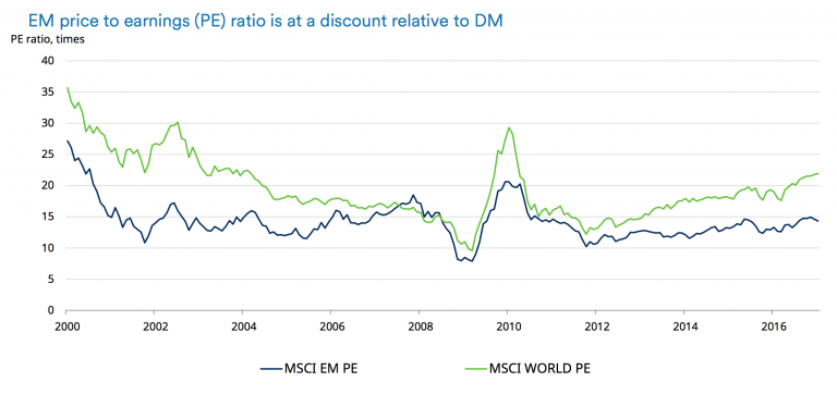 หากเรามองลึกลงไปจะเห็นว่าธุรกิจส่วนใหญ่ของตลาดเกิดใหม่จะยังเป็นภาคการผลิต แต่หลังๆมานี้ก็เริ่มพัฒนามาเป็นภาคบริการและเป็นธุรกิจใหม่ๆอย่างธุรกิจเทคโนโลยีมากขึ้น ในขณะที่ค่า P/E โดยรวมของหุ้นในตลาดเกิดใหม่อยู่ในช่วงราคาที่ถูกกว่าหุ้นของตลาดพัฒนาแล้วมากขึ้นเรื่อยๆ ยิ่งถูกยิ่งทำให้โอกาสในการได้ผลตอบแทนที่สูงขึ้นมากขึ้นในขณะที่ความเสี่ยงลดลง