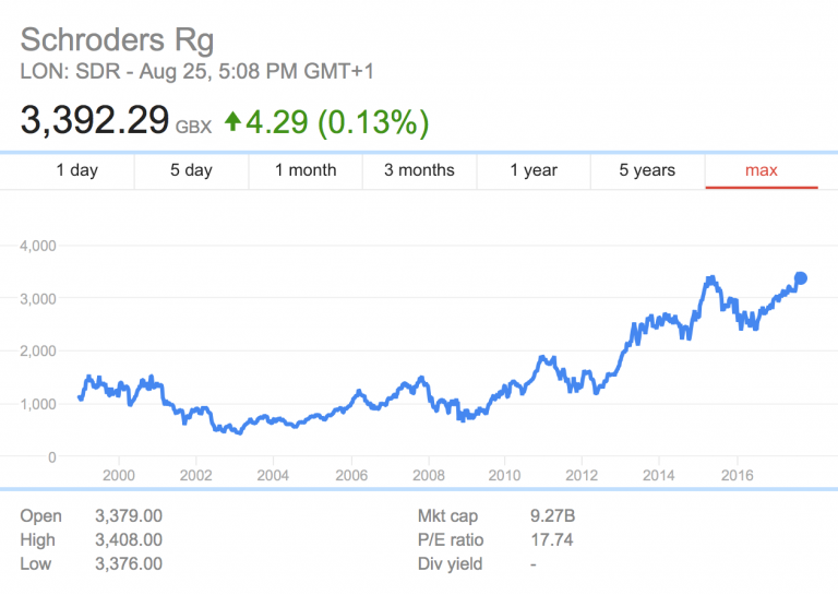 Schroders คือกลุ่มบริษัทบริหารจัดการสินทรัพย์ขนาดใหญ่จากประเทศอังกฤษ ก่อตั้งขึ้นในปี 1804 ปัจจุบันบริษัทมีพนักงานมากกว่า 4,100 คน มีสำนักงานมากกว่า 40 ที่ใน 27 ประเทศทั่วโลก Schroders ยังเป็นบริษัทในตลาดหลักทรัพย์ลอนดอนด้วย โดยมีตัวย่อหุ้นว่า SDR.L ซึ่งถ้าเราลองไปดูผลตอบแทนของหุ้น Schroders จะเห็นว่าหุ้นของบริษัทฟื้นเร็วมากจากปี 2008 และหลังจากนั้นก็ขึ้นมาตลอดถือว่าเป็นบริษัทที่เก่งมากบริษัทหนึ่งเลยทีเดียว
