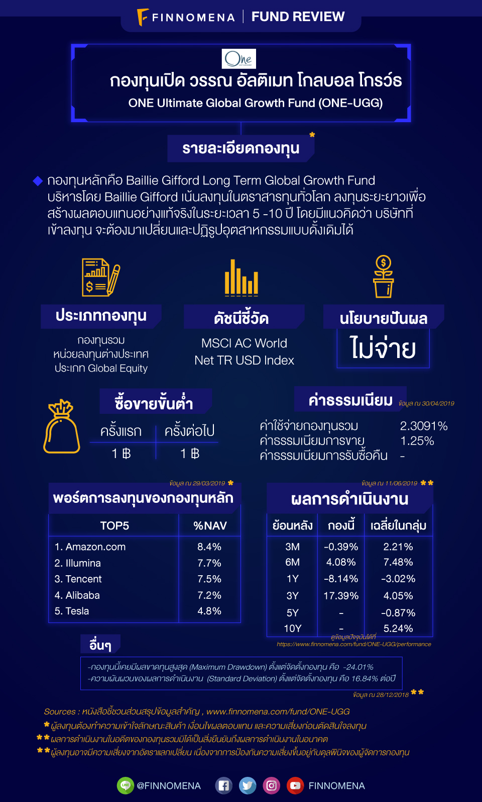 มีกองทุนหุ้นเติบโตเพียงไม่กี่กองที่มีการเติบโตรวดเร็วสมชื่อ กองทุน ONE-UGG เป็นหนึ่งในกองทุนที่สามารถรักษาการเติบโตที่ต่อเนื่องไว้ได้ในระยะยาว กองทุน ONE-UGG มีนโยบายลงทุนในกองทุน Baillie Gifford Long Term Global Growth Investment Fund Class B (Baillie Gifford LTGG) ซึ่งปัจจุบันมีสัดส่วนลงทุน 99.53%
