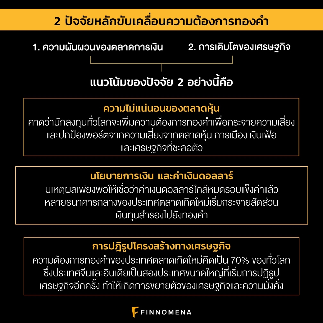 สถานการณ์ตลาดในปีนี้ มองว่ามี 2 ปัจจัยหลักที่จะเป็นแรงขับเคลื่อนความต้องการทองคำ คือความผันผวนของตลาดการเงิน และการเติบโตของเศรษฐกิจ ซึ่งทั้ง 2 ปัจจัยดังกล่าว สามารถแบ่งย่อยออกเป็น 3 แนวโน้มหลักที่คาดว่าจะผลักดันราคาทองคำ ได้แก่