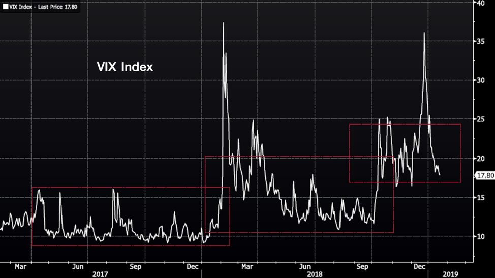 มากกว่านั้นดัชนี VIX หรือดัชนีวัดความกลัวของตลาดหุ้น มีค่าเฉลี่ยที่เพิ่มขึ้นจาก 13 ในไตรมาสที่ 3 ของปี 2018 ไปที่ 21 ในไตรมาสที่ 4 (จากรูปที่ 2 จะเห็นได้อย่างชัดเจนว่า VIX เปลี่ยนกรอบขึ้นมาตลอดปี 2017 ถึง 2019 ส่งสัญญาณความกลัวในตลาดที่เพิ่มขึ้นอย่างต่อเนื่อง)