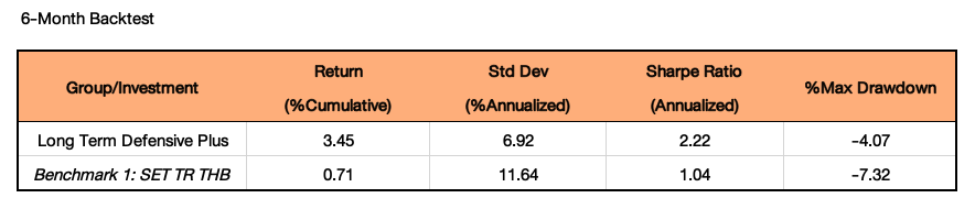หลังจากนั้นทดลองวาดกราฟผลตอบแทน และคำนวณผลตอบแทนเฉลี่ย ความผันผวน Sharpe Ratio และ Maximum Drawdown ย้อนหลังตามช่วงเวลาที่แตกต่างกัน เปรียบเทียบระหว่างแผน Long Term Defensive Plus เทียบกับดัชนี SET Total Return ได้ผลตามรูปและตารางที่แสดงไว้ด้านล่าง