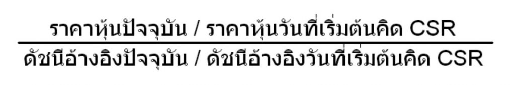 ตัวอย่างตารางด้านล่างแสดงให้เห็นวิธีการคำนวณ CSR ของ INTUCH และ PTT ซึ่งแสดงค่าของ CSR ไว้ที่ สองช่องสุดท้าย โดยมีวันที่เริ่มต้นคิด CSR คือ วันที่ 25 ธันวาคม 2014 ยกตัวอย่างเช่น CSR ของ INTUCH วันที่ 30 ธ้ันวาคม 2014 เกิดจาก (78.75 / 78.25) / (1,479.67 / 1,504.89 ) = 1.01124