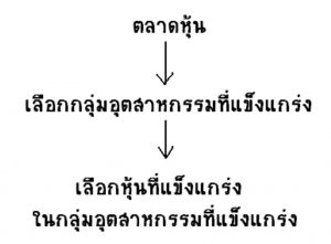 เมื่อเราได้กลุ่มอุตสาหกรรมที่มีความแข็งแกร่งลำดับต้น ๆ แล้ว จากนั้นก็เลือกหุ้นที่มีความแข็งแกร่งมากที่สุดในกลุ่มน้ั้น ๆ แต่……..หลังจากได้รายชื่อหุ้นที่น่าสนใจมาแล้วเราจะไม่ซื้อหุ้นนั้นทันที เพราะรายชื่อหุ้นที่ได้จะเป็นกลุ่มที่น่าสนใจซื้อขายเท่านั้น เราจะต้องติดตามกราฟหุ้นและหาจังหวะซื้อขายต่อไป