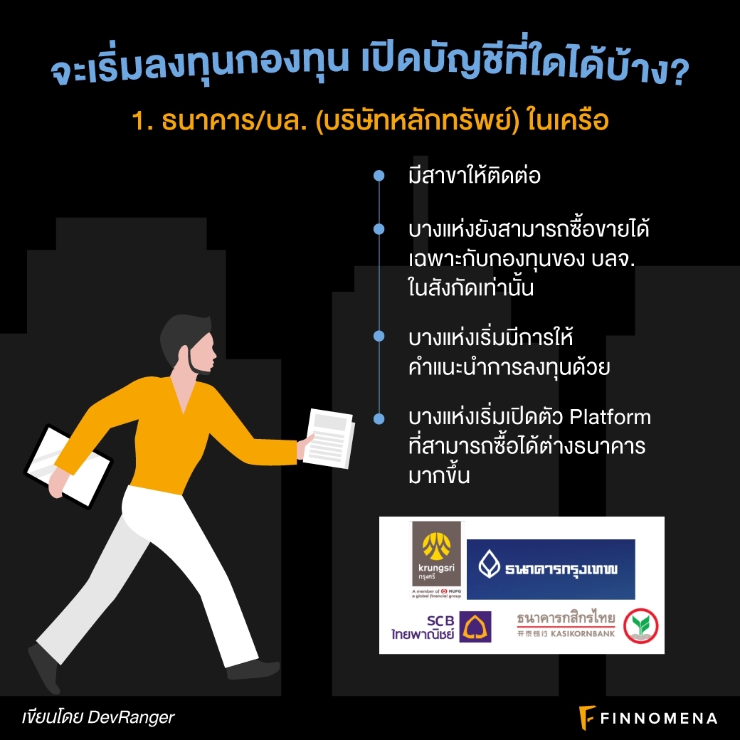 ตัวเลือกแรกๆ ที่คนมักจะนึกถึง ปัจจุบันเกือบทุกธนาคารก็มักจะมีบริการให้นักลงทุนทุกท่านเข้าไปเปิดบัญชีกองทุนรวมได้ง่ายๆ เพียงแค่เดินเข้าไปที่สาขาธนาคารและแจ้งความประสงค์กับพนักงานสาวสวยที่รอต้อนรับทุกท่านอยู่