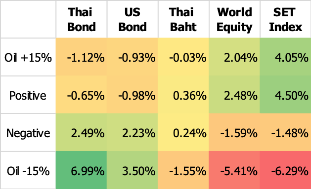 สิ่งที่ต้องระวังคือความสัมพันธ์นี้ไม่สมมาตร เมื่อน้ำมันปรับตัวบวกแรงกว่า 15% หุ้นอาจปรับตัวสูงขึ้นเพียง 2-4% และตราสารหนี้ก็อาจไม่ได้ปรับตัวลงมากนัก เหตุการณ์นี้ ส่วนใหญ่เกิดขึ้นจากขาขึ้นของน้ำมันมักมากับตลาดการเงินที่เปิดรับความเสี่ยง แต่พอถึงจุดหนึ่งราคาน้ำมันที่สูงจะกลายเป็นต้นทุนที่กดดันเศรษฐกิจจนทำให้กระแสบวกตีกลับ
