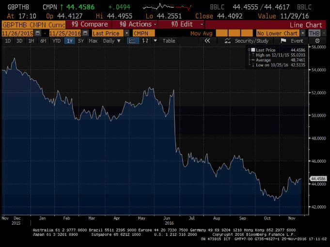 ซึ่งในปีที่ผ่านมาอ่อนค่าถึง 16% จาก 53 บาท/ปอนด์มาอยู่ที่ 44 บาท/ปอนด์และมีจังหวะลงไปต่ำสุดที่ 42 บาท/ปอนด์ (ต่ำสุดในรอบ 18 ปี) ทั้งนี้ก็เนื่องจากปัญหาการเมืองในประเทศ (Brexit) ที่ส่งผลกระทบให้เกิดความไม่แน่นอนกับเศรษฐกิจอังกฤษจนเกิดกระแสเงินทุนไหลออก ธนาคารกลางอังกฤษต้องปรับลดดอกเบี้ยเพื่อพยุงความเชื่อมั่น อีกประเด็นหนึ่งที่น่าสนใจคือการขอคืนภาษีซึ่งน่าจะได้คืนอีกราว 11% (อ้างอิงจากเว็บไซต์ Global Blue) บวกกับค่าเงินระดับนี้แล้วดูน่าสนใจมากทีเดียว ปีหน้ามองปัจจัยที่ต้องจับตาคือแผนการออกจากสหภาพยุโรปของรัฐบาลอังกฤษ (คาดว่าจะเสนอรัฐสภาอังกฤษและอียูในช่วงไตรมาส 1) มีความเป็นไปได้ที่ค่าเงินปอนด์อ่อนได้อีกถ้าอังกฤษดึงดันจะออกจากสหภาพยุโรปจริง แต่ในทางกลับกันถ้าปัญหา Brexit เริ่มคลี่คลายก็อาจจะต้องรีบซื้อปอนด์เพราะอาจแข็งค่ากลับขึ้นได้อย่างรวดเร็ว