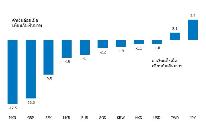 อัตราการเปลี่ยนแปลงของค่าเงินต่าง ๆ เทียบกับเงินบาทนับจากต้นปี