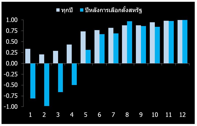 ที่น่าตื่นเต้นไปกว่านั้นคือถ้าผมแยกการเปลี่ยนแปลงของ “ปีถัดจากการเลือกตั้งของสหรัฐ” ออกมาจะพบว่าทิศทางค่าเงินในเดือนมกราคมของปีถัดจากการเลือกตั้งของสหรัฐ 4 ครั้งล่าสุด “สวนทาง” กับทิศทางค่าเงินบาททั้งปีของปีนั้นๆ “ทุกครั้ง” ไม่ว่าจะด้านแข็งหรืออ่อน เช่นปี 2001 ที่ Bush แข่งกับ Al Gore เงินบาทแข็งค่า 2% ในเดือนม.ค. แต่อ่อนค่า 1.8% ทั้งปี หรือในปี 2009 ที่ Obama แข่งกับ McCain เงินบาทอ่อนค่า 0.65% ในเดือนม.ค. แต่แข็งค่า 4% ทั้งปี อย่างไรก็ตามท้ายที่สุดค่าเงินจะกลับมามีทิศทางชัดเจนว่าแข็งหรืออ่อนหลังจากผ่านครึ่งปีแรกไปแล้วเช่นกัน