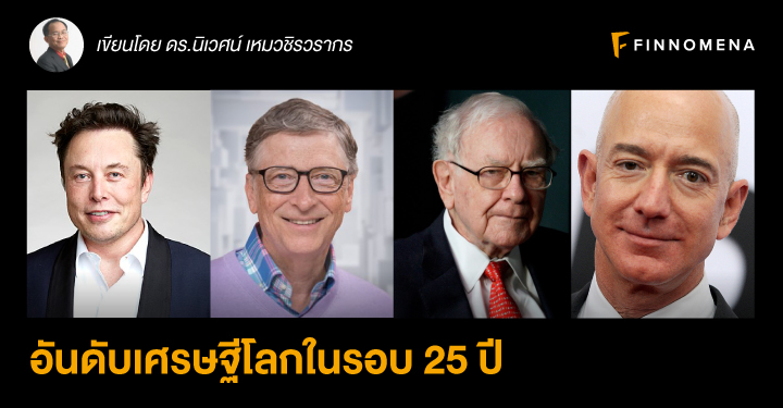 ข่าว “น่าตื่นเต้น” ในแวดวงการเงินการลงทุนเมื่อสัปดาห์ที่แล้วก็คือการที่ อีลอน มัสก์ เจ้าของและผู้ก่อตั้งบริษัทผลิตรถยนต์ไฟฟ้าเทสลากลายเป็นบุคคลที่รวยที่สุดในโลกแทนที่เจฟฟ์ เบซอส เจ้าของและผู้ก่อตั้งบริษัทอีคอมเมิร์ซอะมาซอน อานิสงส์จากการที่หุ้นเทสลาปรับตัวขึ้นไปอย่างแรงและรวดเร็วตั้งแต่ต้นปี 2563 ซึ่งหุ้นขึ้นไปถึงกว่า 5 เท่าในเวลาเพียงปีเดียว ทำให้อีลอน มัสก์ ซึ่งในช่วงต้นปี 2563 ที่เคยมีความมั่งคั่งเพียงประมาณ 2.7 หมื่นล้านเหรียญและยังไม่ติด 50 อันดับเศรษฐีโลกด้วยซ้ำ ร่ำรวยขึ้นมาเป็น 1.88 แสนล้านดอลลาร์หรือประมาณ 5.6 ล้านล้านบาทในวันที่ 7 มกราคม 2564 และนี่น่าจะถือเป็นการเปลี่ยนแปลงที่รวดเร็วที่สุดในประวัติศาสตร์ของเศรษฐีหมายเลย 1 และหมายเลขต้น ๆ ของโลก แต่ถ้าจะพูดไป การเปลี่ยนแปลงของอันดับเศรษฐีโลกนั้นดูเหมือนว่าจะมีการเร่งตัวขึ้นเรื่อย ๆ ตามวิวัฒนาการของเทคโนโลยีของโลกที่เปลี่ยนแปลงไปรวดเร็วขึ้นเรื่อย ๆ ที่ทำให้กิจการไฮเท็คมีมูลค่าเพิ่มขึ้นอย่างรวดเร็วและทำให้เจ้าของบริษัทร่ำรวยตามกันไป เรามาดูกันว่าในรอบ 25 ปีที่ผ่านมา ใครคือคนที่มั่งคั่งที่สุดในแต่ละปีและเพราะอะไร
