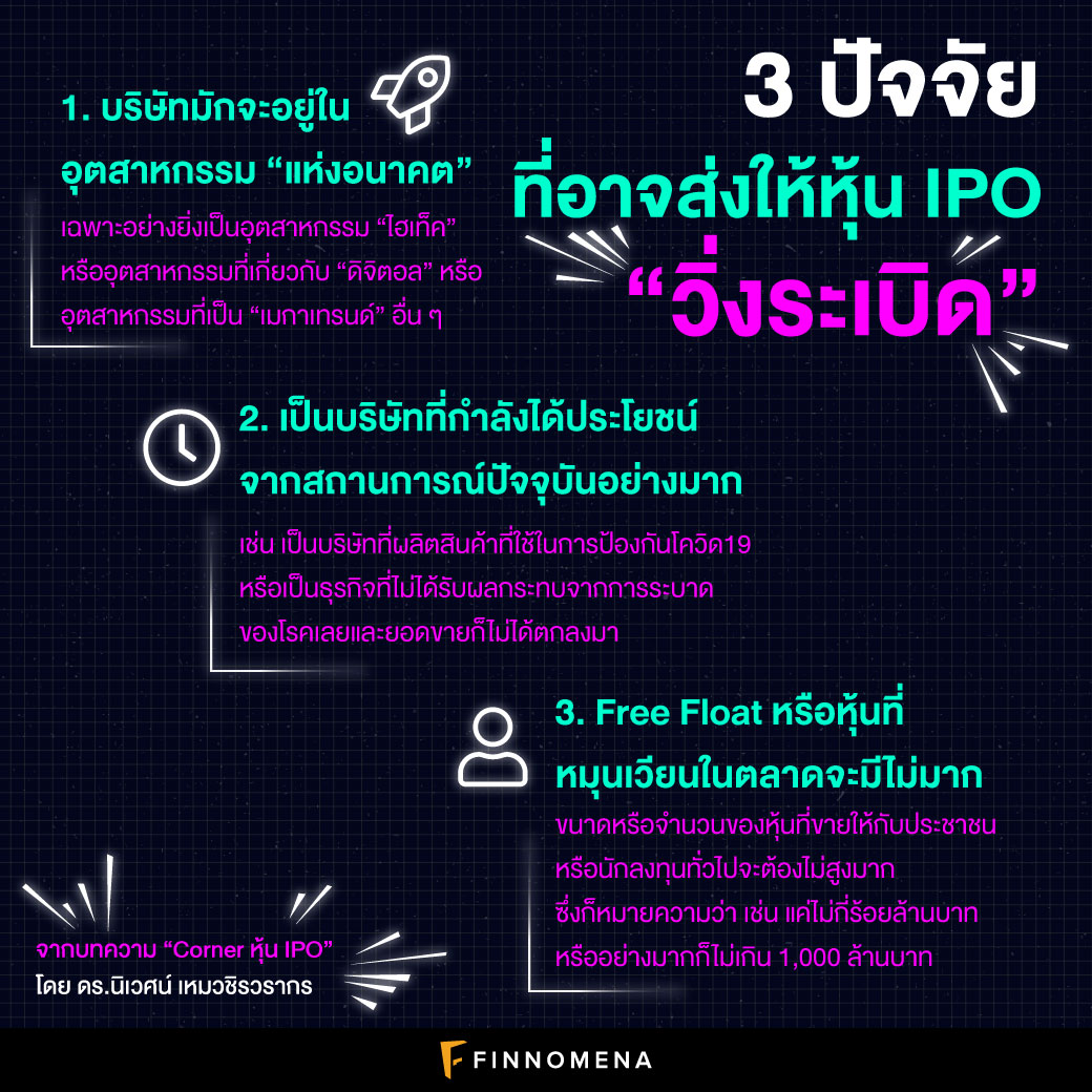 แต่ไม่ใช่หุ้น IPO ทุกตัวจะประสบความสำเร็จ การคาดการณ์ว่าหุ้นตัวไหนจะ “วิ่งระเบิด” นั้นผมคิดว่าน่าจะต้องมีปัจจัยต่าง ๆ ที่เกี่ยวข้องกับการเก็งกำไรมากกว่าพื้นฐานที่แท้จริงของกิจการและความถูกแพงของราคาหุ้น ซึ่งผมจะลองเสนอเป็นข้อ ๆ ดังต่อไปนี้
