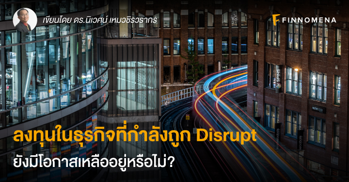 “โอกาส” ที่อาจจะเกิดขึ้นก็คือ ธุรกิจหรือหุ้นที่คนคิดว่าถูก Disrupt หรือกำลังถูก Disrupt นั้น ไม่ถูก Disrupt จริง หรือถูก Disrupt แค่บางส่วน หรือใช้เวลานานมากก่อนที่มันจะถูกทดแทนได้ทั้งหมดซึ่งทำให้ธุรกิจยังคงหากินหรือทำกำไรได้ไปอีกนานและคุ้มที่จะลงทุน ถ้าเราเจอหุ้นแบบนี้ที่มีราคาตกลงมามากเกินไป มันก็อาจจะเป็นโอกาสที่เราจะเข้าไปลงทุนและทำผลตอบแทนทบต้นได้ดีพอ เช่น 10-15% ต่อปีต่อเนื่องไปอีกซัก 10 ปี เป็นต้น