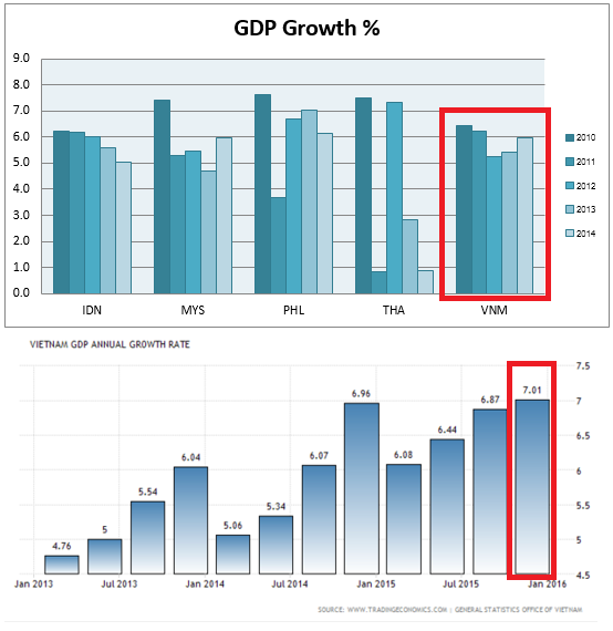 เริ่มเลยเรามาดูการเติบโตของผลิตภัณฑ์มวลรวมในประเทศ (GDP) ของประเทศเวียดนาม เมื่อเทียบกับประเทศข้างเคียงรวมถึงไทยเราด้วยจะเป็นอย่างไร … การเติบโตของ GDP เวียดนามนั้นใน 3-4 ปี ที่ผ่านมานั้นเติบโตเมื่อเทียบกับปีก่อนอยู่ในระดับที่สูง (5-6%) มาโดยตลอด และไตรมาส 4 ของปี 2558 ก็โตเกิน 7% ไปเป็นที่เรียบร้อยแล้วดังแสดงในรูป