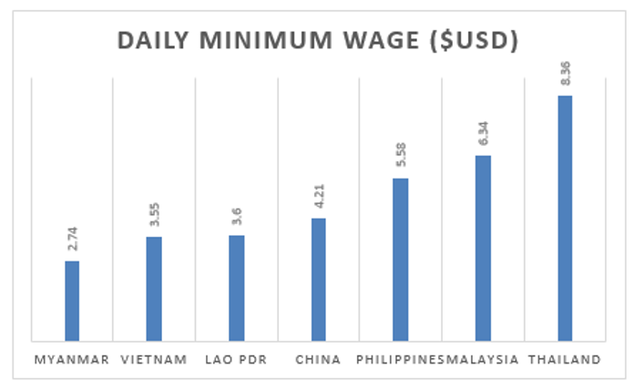 ประเทศเวียดนามได้มีการทำสัญญาการค้ากับหลายประเทศ โดยมีปัจจัยการผลิตที่ได้เปรียบกว่าที่อื่นคือ ค่าแรงที่ถูกกว่าที่อื่นมากดังรูปด้านล่าง หากเราสนใจประเทศในกลุ่ม ASEAN และจีน พบว่าเวียดนาม มีค่าแรงอยู่ที่ระดับต่ำมาก USD 3.55 หรือประมาณ 125 บาทต่อวันเท่านั้น เมื่อเทียบกับ ประเทศจีนที่เคยค่าแรงถูก ปัจจุบันอยู่ที่ USD 4.21 หรือแม้แต่ไทยเราอยู่สูงถึง USD 8.36