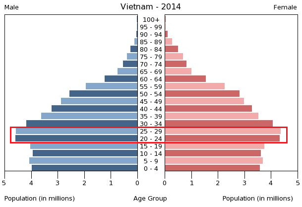 จากรูปจะเห็นว่าช่วงอายุคนที่มีจำนวนมากที่สุดของประเทศคือ กลุ่มคน (20-29 ปี) ซึ่งกลุ่มคนนี้ อยู่ในช่วงเริ่มที่จะเข้าสู่การทำงาน และจะผลักดันให้การบริโภคในประเทศเติบโตขึ้นอย่างมาก! (ปัจจุบันการบริโภค มีสัดส่วนประมาณ 65% ของ GDP)