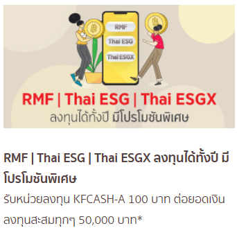 โปรโมชันพิเศษ เมื่อลงทุนสะสมทั้งปี 2569 ในกลุ่มกองทุน RMF และ Thai ESG/ Thai ESGX-69 ที่ร่วมรายการของ บลจ.กรุงศรี รับเพิ่ม หน่วยลงทุน KFCASH-A มูลค่า 100 บาทต่อยอดเงินลงทุนสะสมทุกๆ 50,000 บาท ตามเงื่อนไข* รายละเอียดเพิ่มเติม : https://www.krungsriasset.com/TH/News/Promotion/Tax_Saving_Plan_2026/