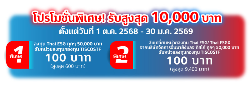 พิเศษ 2 สงวนสิทธิ์สำหรับลูกค้าที่สับเปลี่ยนหน่วยลงทุนกองทุน Thai ESG/Thai ESGX จากบลจ.อื่นมายังกองทุน Thai ESG/Thai ESGX บลจ.ทิสโก้ ตั้งแต่วันที่ 1 ต.ค. 68 – 30 ม.ค. 69 โดยยอดเงินสับเปลี่ยนเข้ากองทุนทุกๆ 50,000 บาท จะได้รับหน่วยลงทุน TISCOSTF มูลค่า 100 บาท สูงสุด 9,400 บาท