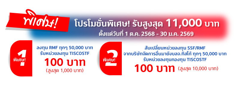 พิเศษ1 สงวนสิทธิ์สำหรับลูกค้าบุคคลธรรมดาที่มียอดเงินลงทุนกองทุน RMF ที่ร่วมรายการ ตั้งแต่วันที่ 1 ต.ค. 68 – 30 ม.ค. 69 โดยยอดเงินลงทุนทุกๆ 50,000 บาท จะได้รับหน่วยลงทุนกองทุนเปิด ทิสโก้ พันธบัตรระยะสั้น (“TISCOSTF”) มูลค่า 100 บาท สูงสุด 1,000 บาท