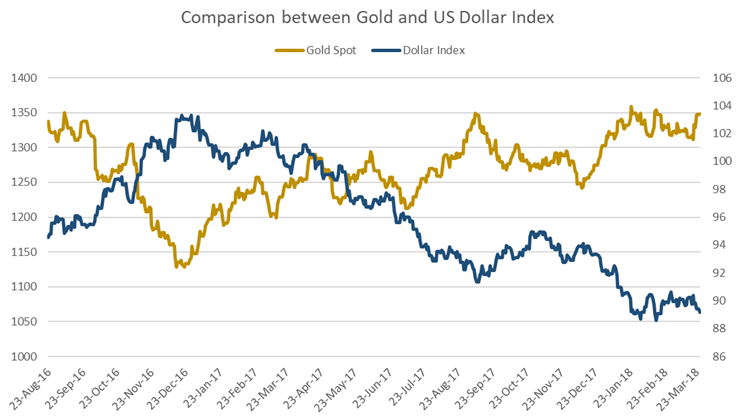 รูปที่ 9 กราฟราคาทองคำและดัชนีค่าเงินดอลลาร์ ถึงวันที่ 28 มี.ค. 2560: ที่มา Bloomberg