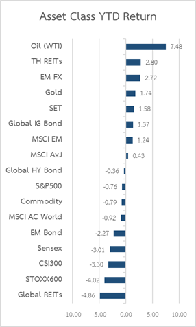 Global REITs ยังคงถูกกดดันจากภาวะดอกเบี้ยขาขึ้น ขณะที่ตลาดตราสารหนี้เริ่มฟื้นตัวจากอัตราผลตอบแทนของตราสารหนี้ที่ลดลง ตลาดหุ้นทั่วโลกปรับตัวลงจากเดือนที่แล้วจากความเสี่ยงด้านสงครามการค้าของสหรัฐฯ กลุ่มสินค้าโภคภัณฑ์เช่น น้ำมัน และทองคำ ก็ยังมีการฟื้นตัวขึ้นมาอย่างต่อเนื่อง ขณะที่ดัชนี SET ยังคงเคลื่อนไหวในกรอบ 1,770-1,850 จุด
